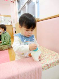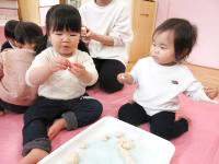 小麦粉粘土をしました。 小さくちぎる、びよ~んと伸ばすなど、 感触を楽しんでいました。 また、紙皿や紙コップを用意すると、 食べる真似をして「おいしい」と言ったり、 紙コップに粘土を入れて 友だちに「どうぞ」と渡したりするなど 友だちと関わろとする姿が見られ、微笑ましかったです。