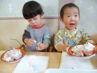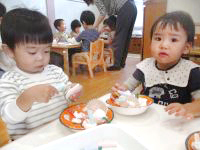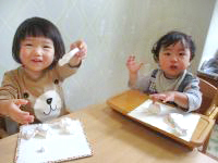 紙粘土で遊びました。「こねこね」「もみもみ」と
