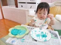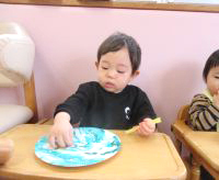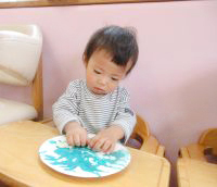 クリスマス製作をしました。 紙皿に絵の具で色をつけたり、シールを貼ったりして クリスマスリースを作りました。 シールを貼ることに少しずつ慣れ、 保育者が少し台紙を折っておくと、 台紙からシールを取って貼ることができるようになりました。